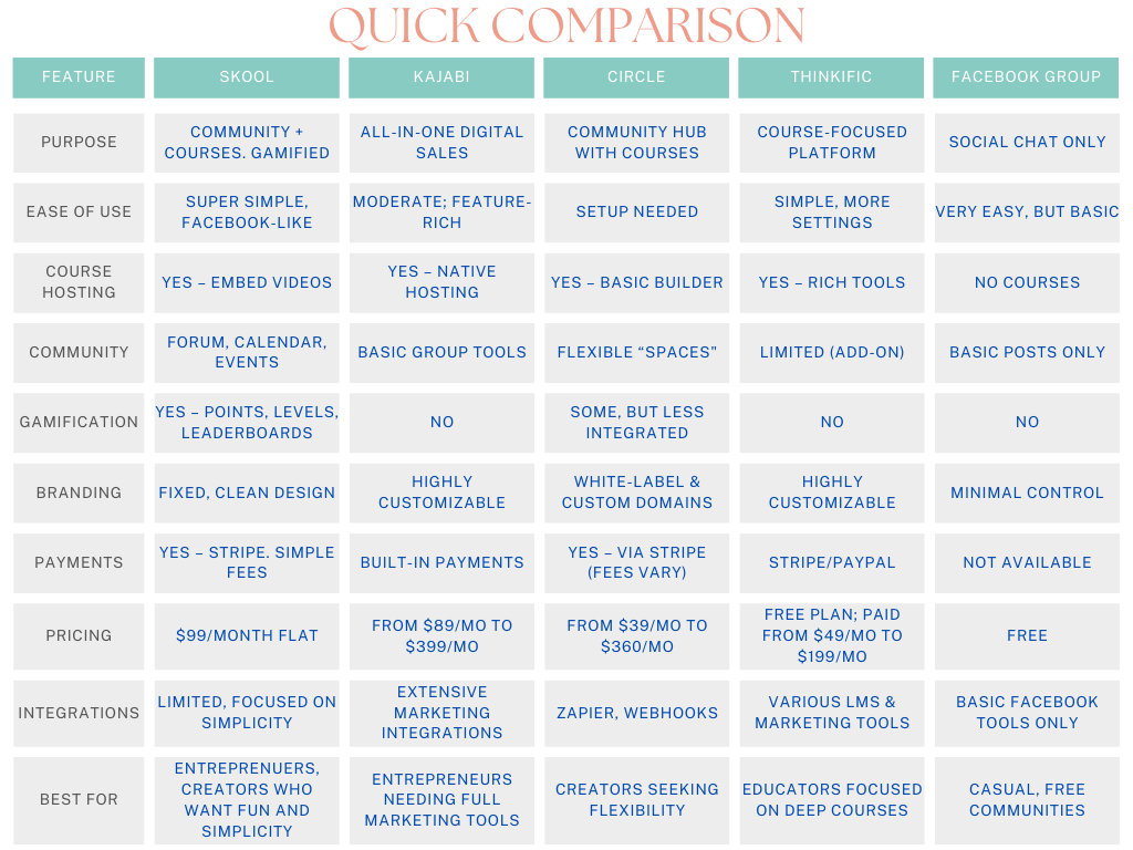 A: Unlike Teachable, Skool integrates community + courses seamlessly. Compared to Facebook, it’s more business-friendly with built-in monetization.
