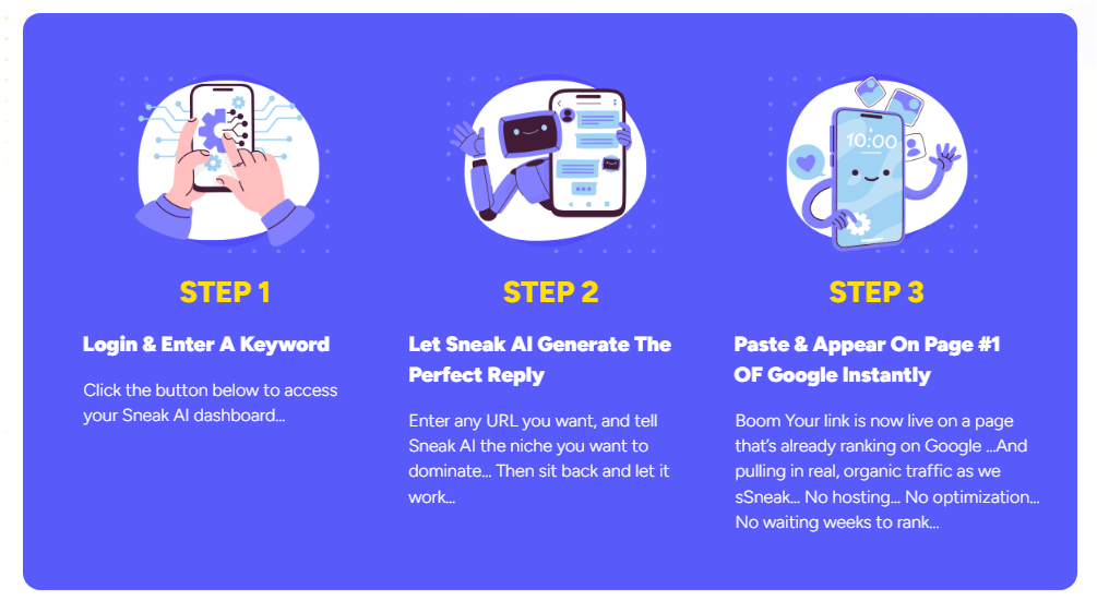 Sneak AI is an AI-driven app that allows users to appear on Google’s first page in 30 seconds or less, by injecting optimized replies (with your link) directly into already-ranking Google content.